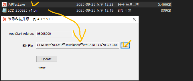 3. bin file 오른쪽의 .....을 눌러 압축 파일에 동봉된 LCD 251113.bin 파일을 선택하고 Update 버튼을 누른다