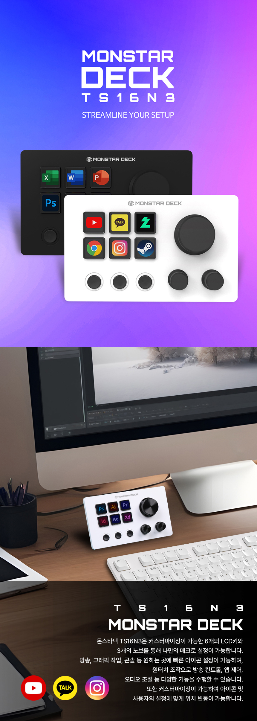 몬스타덱 TS16N3은 커스터마이징이 가능한 6개의 LCD키와 3개의 노브를 통해 나만의 매크로 설정이 가능합니다.