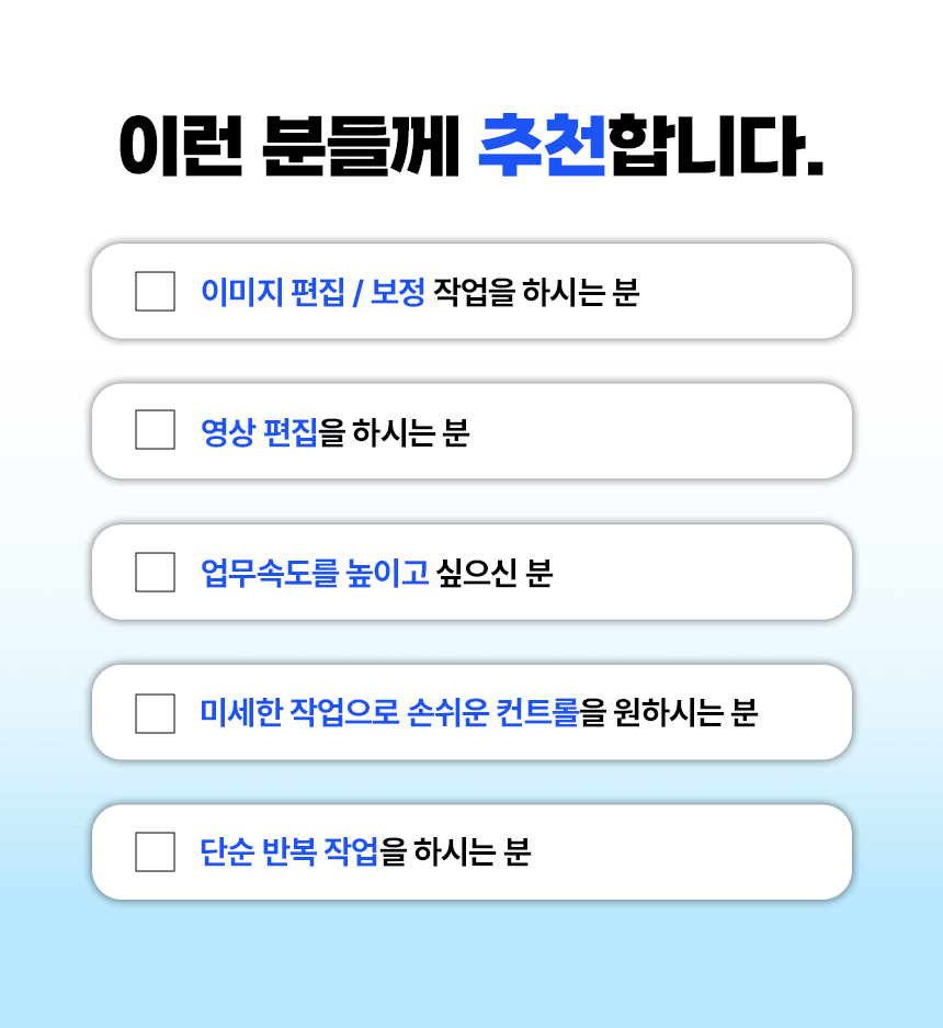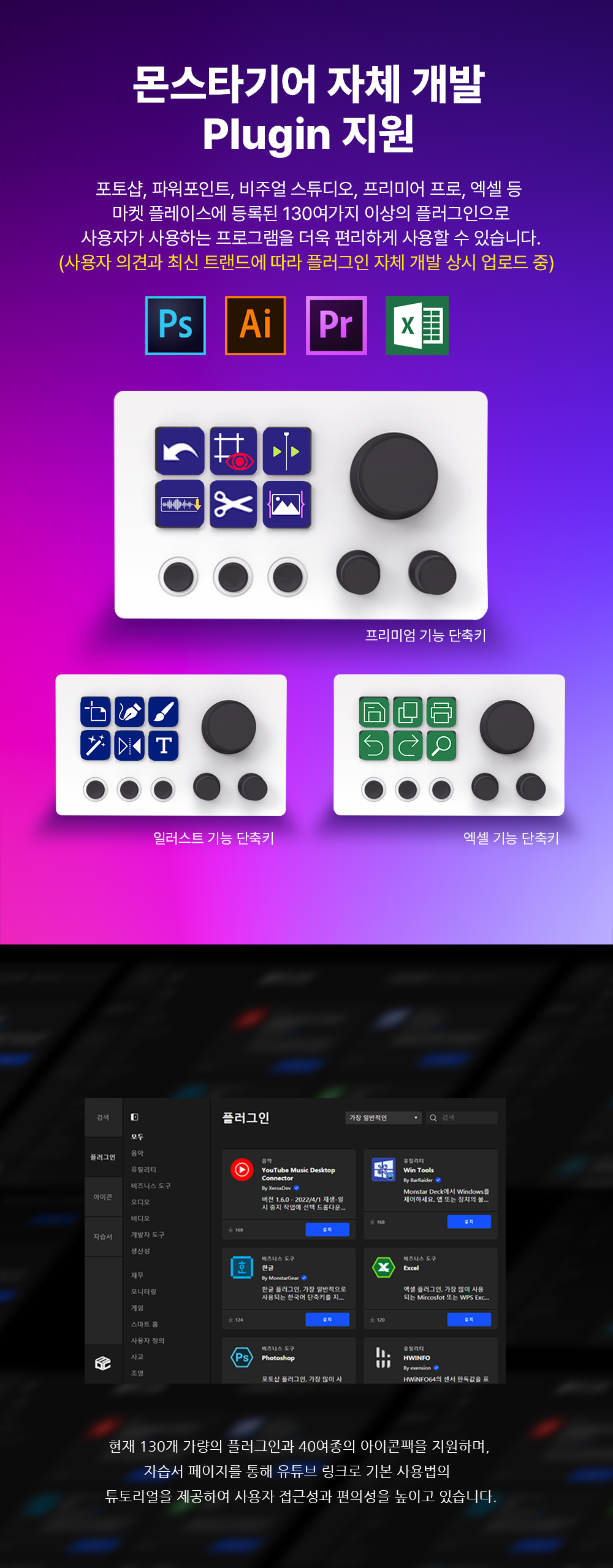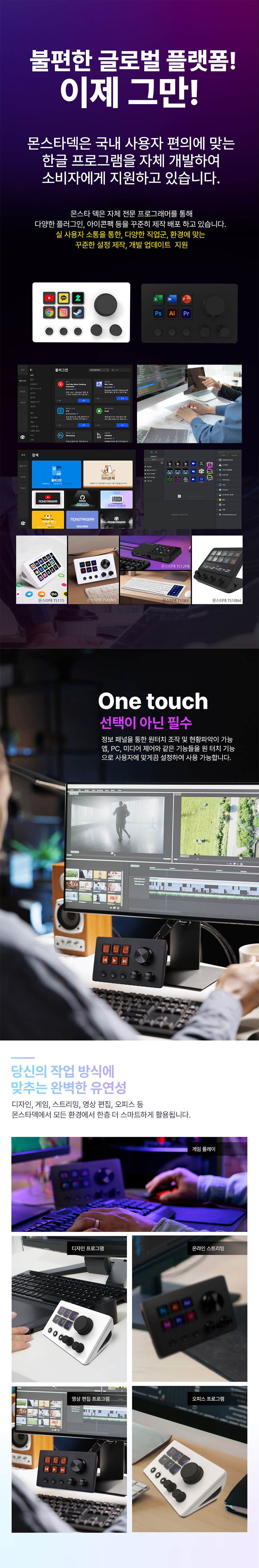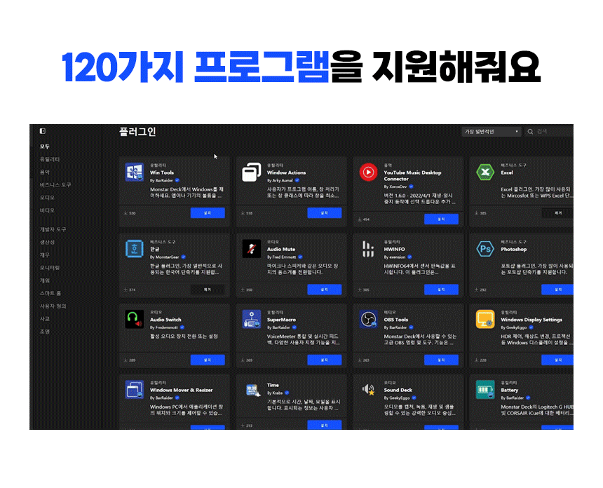 방송,그래픽 작업, 콘솔 등 원하는 곳에 빠른 아이콘 설정이 가능하며, 원터치 조작으로 방송 컨트롤, 앱 제어, 오디오 조절 등 다양한 기능을 수행할 수 있습니다. 또한 커스터마이징이 가능하여 아이콘 및 사용자의 설정에 맞게 위치 변동이 가능합니다.