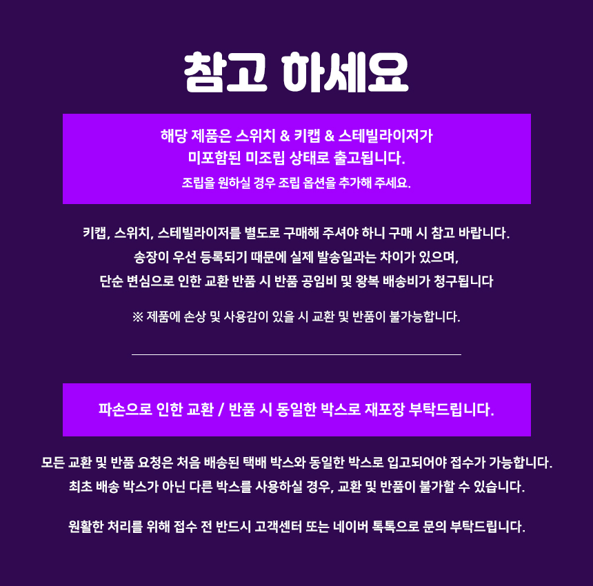 자사의 QC 기준, 교환, 반품, A/S 규정은 상품페이지 최하단의 규정 및 약관 확인 부탁드립니다.
